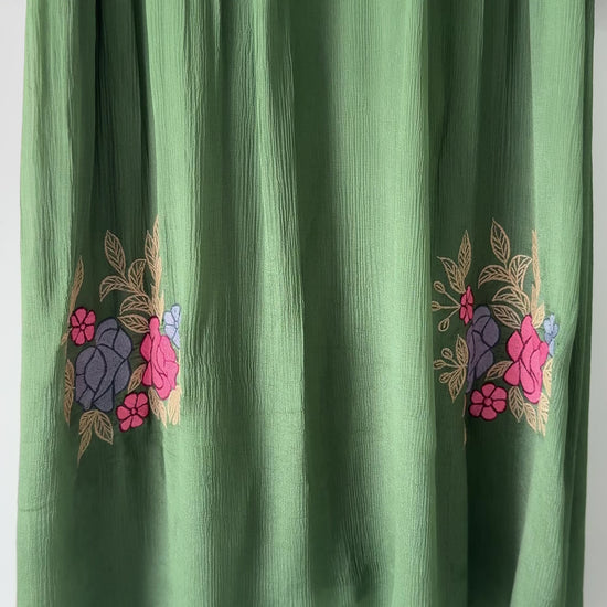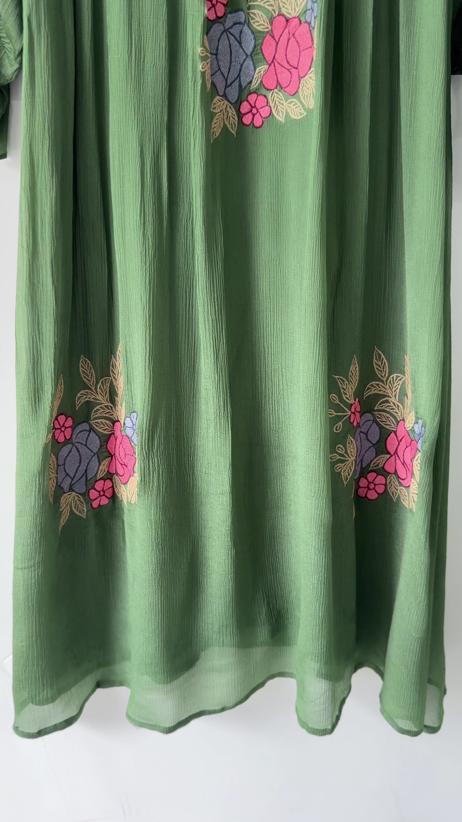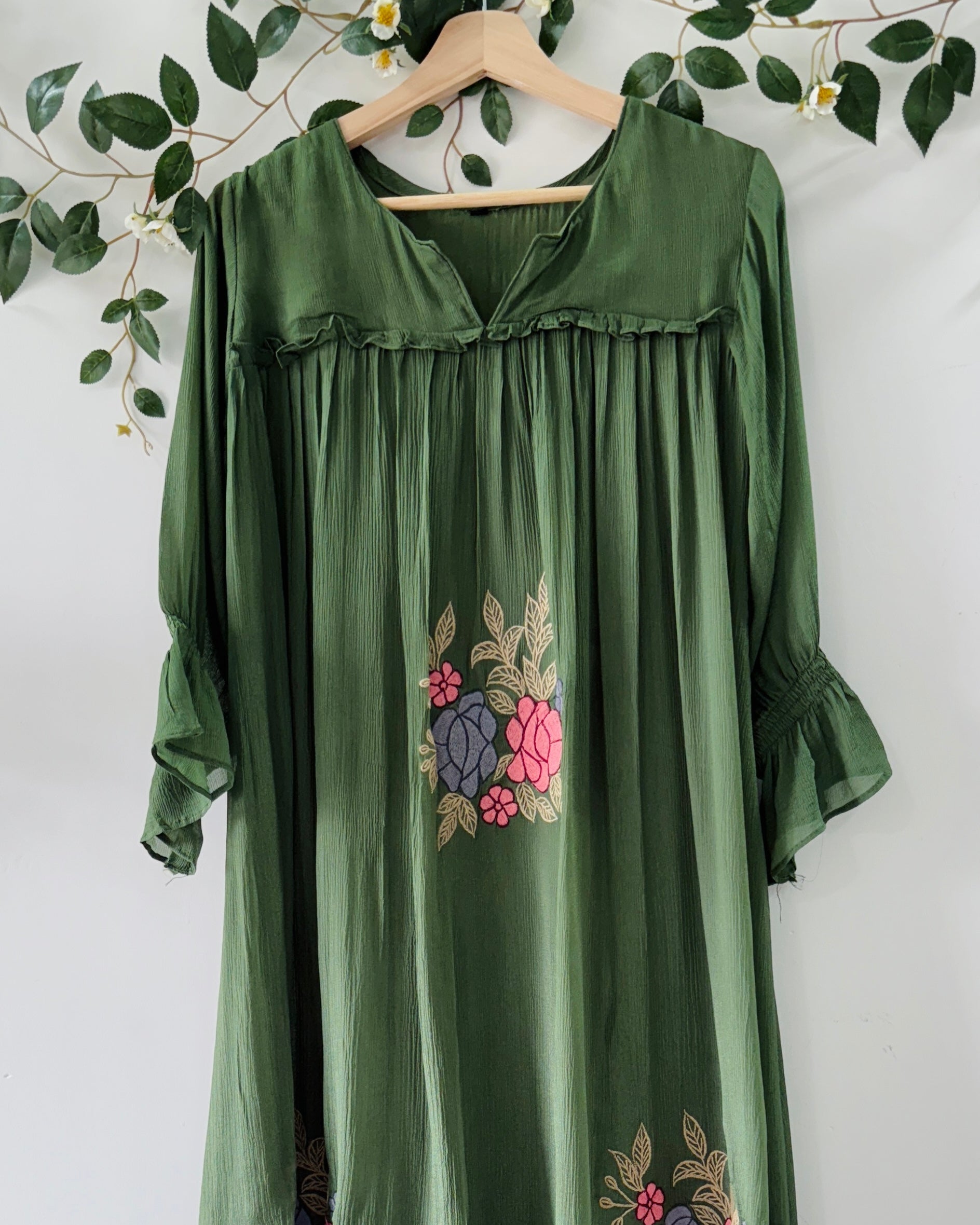 Add a pop of color to your wardrobe with this elegant green dress. Adorned with vibrant floral embroidery in shades of pink, blue, and biege, it perfectly balances boldness with grace. The soft pleats, delicate ruffle detail on the yoke, and flared 3/4th sleeves bring out a breezy bohemian charm.