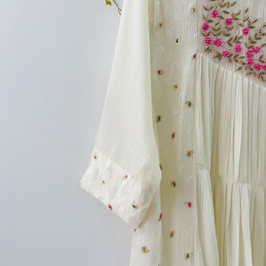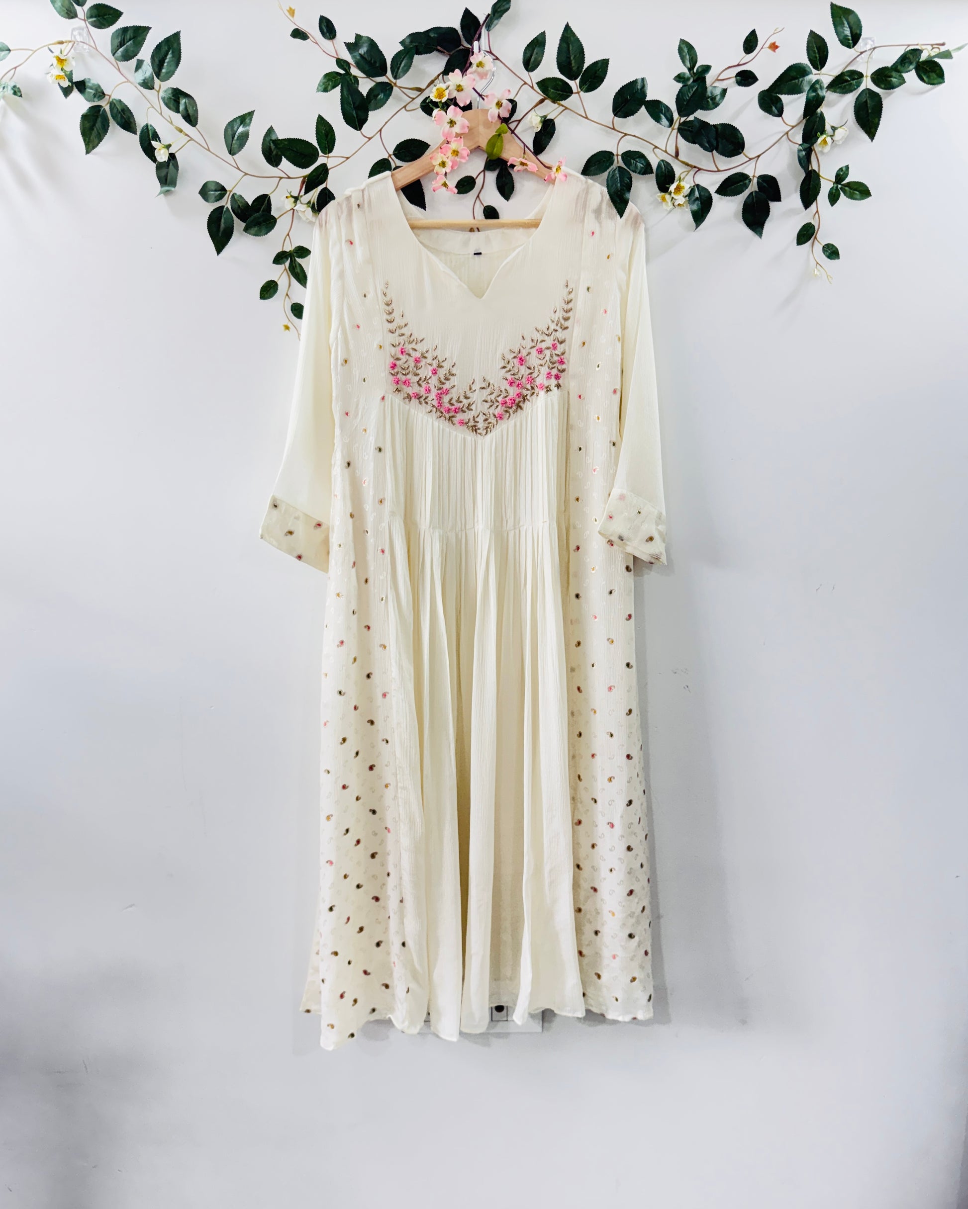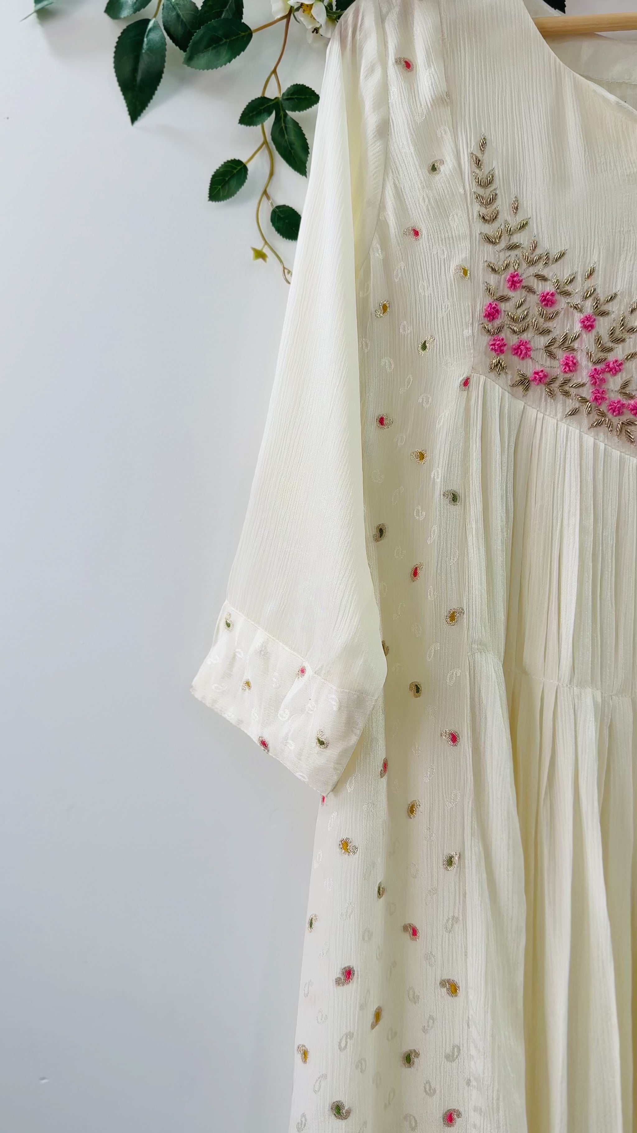 Bring elegance to your everyday style with this ivory A-line dress, designed with delicate hand-inspired floral embroidery in soft pink tones across the yoke. The subtle golden accents and scattered floral motifs on the fabric add a graceful touch, making it perfect for both casual and semi-formal occasions.