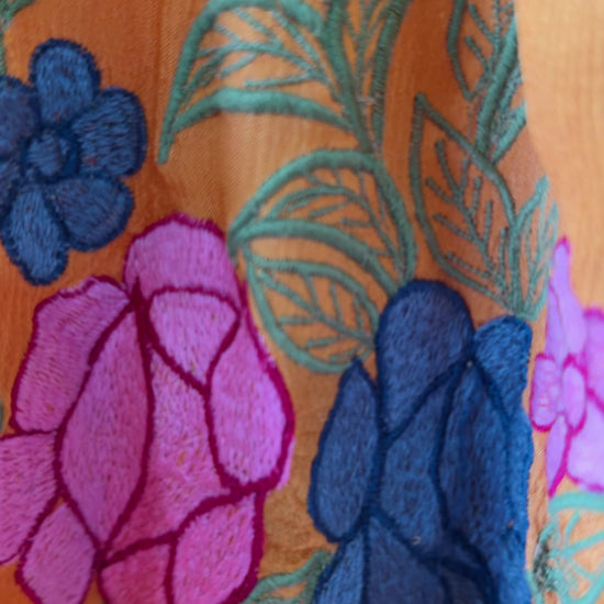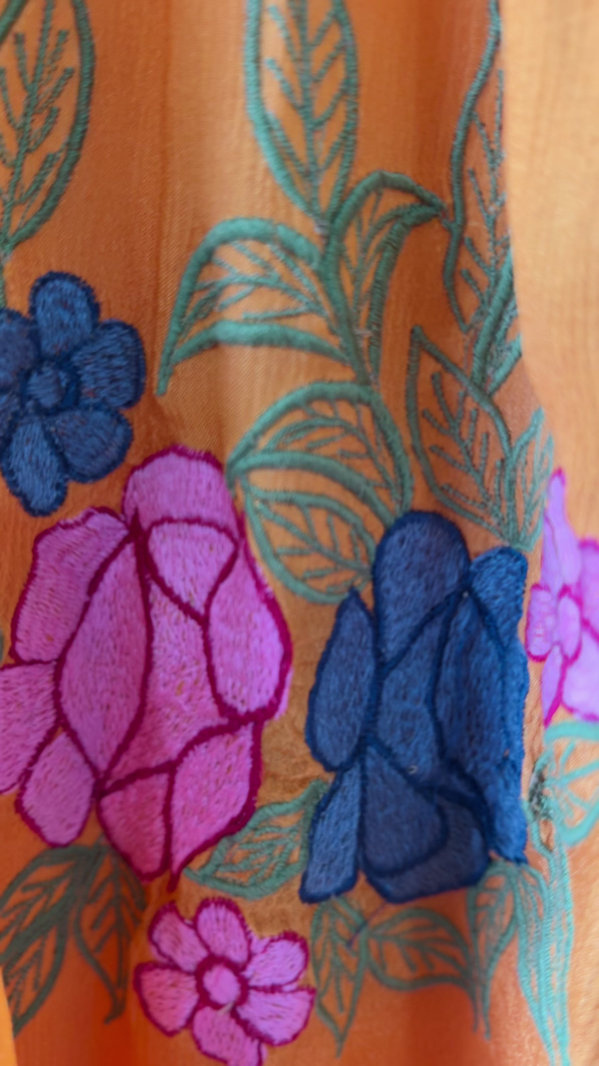 Brighten up your wardrobe with this vibrant mustard-orange midi dress, designed for effortless charm and comfort. Crafted in a soft, flowy fabric, it features delicate floral embroidery in rich tones of purple, pink, and green, adding a feminine touch to its bold hue.