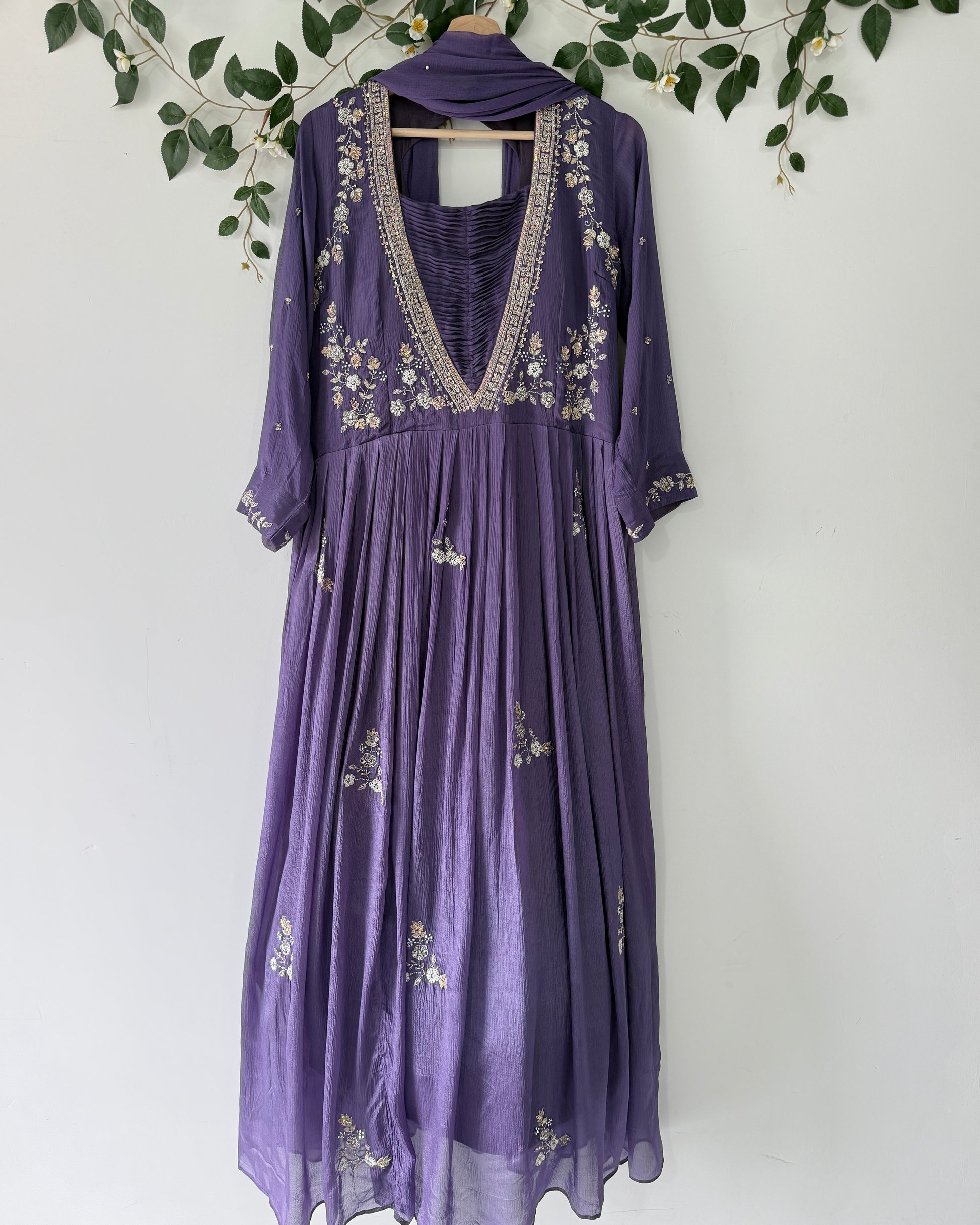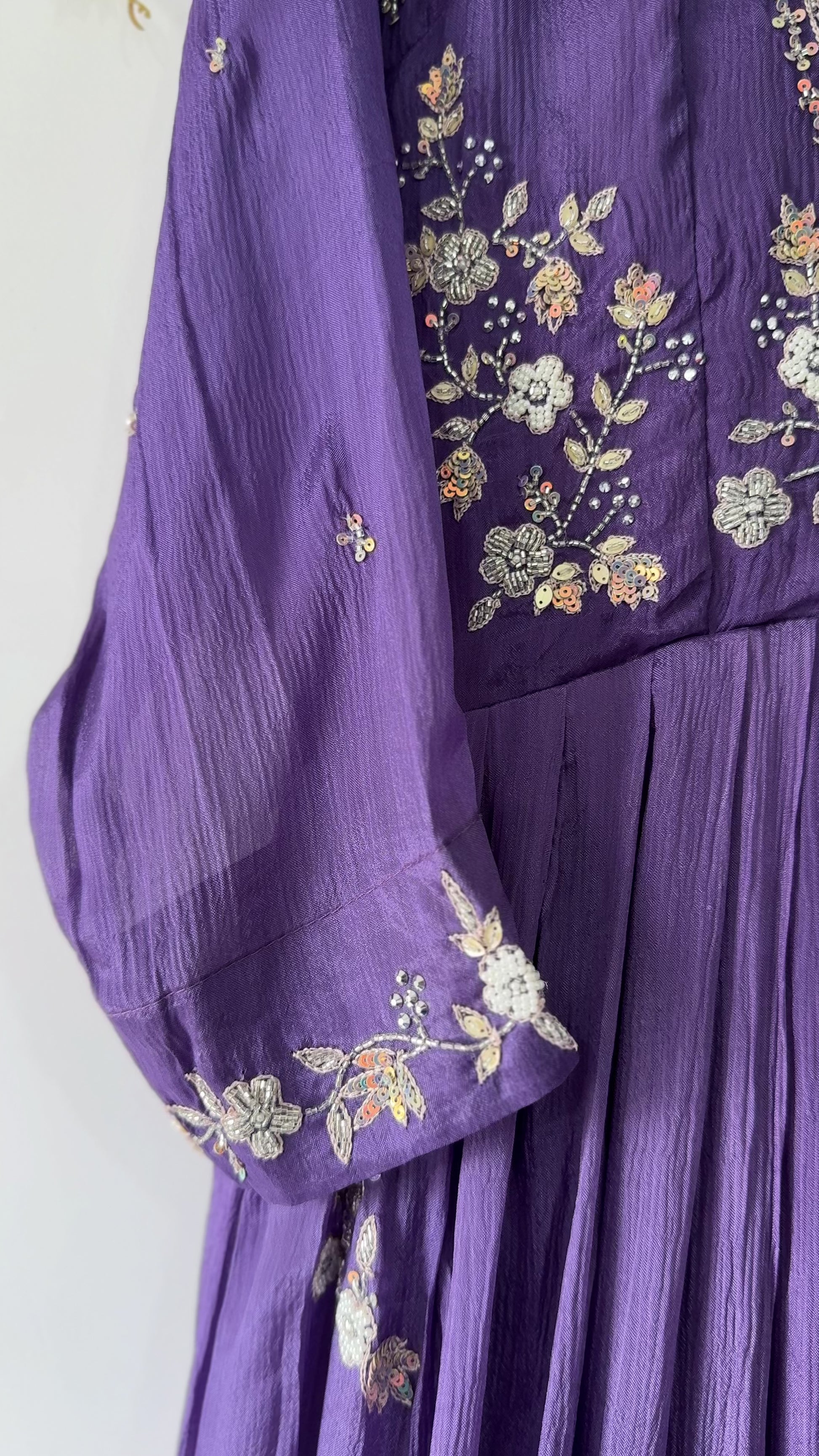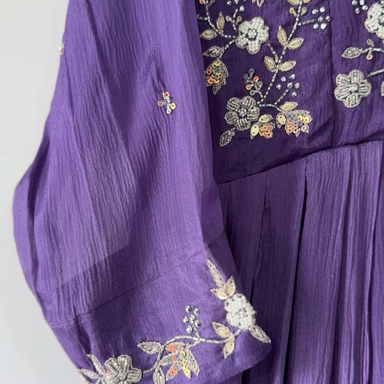 Step into timeless elegance with this royal purple Anarkali dress, beautifully adorned with intricate golden and silver embroidery. The deep V-neckline with detailed hand-style work adds a regal touch, while the flowy pleated silhouette enhances its graceful charm.
